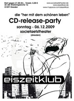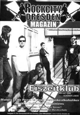 | 18.04.09 | EISZEITKLUB on the road Jetzt ist es fest: am 1.5. spielen wir im Dresdner Beatpol (ex-Starclub) als Support für Super 700. Am 24.4. sind wir bereits unterwegs auf unserer KlubTour. Start ist in Magdeburg im Studentclub Baracke - mit den Bands des PopKulTour-Festivals. Alle Termine findet Ihr unter Konzerte |